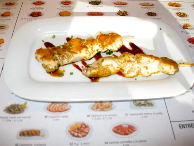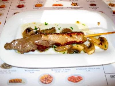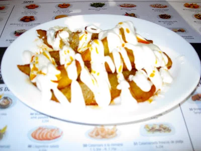 /We went to a very nice restaurant that was called Tapa Tapa the food was so good we actually ate there three times. I love kabobs, if there is a restaurant with kabobs I will definitely order the Kabob. I chose to get the spicy potato because I missed having something spicy to eat, but they weren't that spicy they had chorizo and the white sauce I am not quite sure what it was. The best thing was that after we ate we went into Miu Miu which was great !